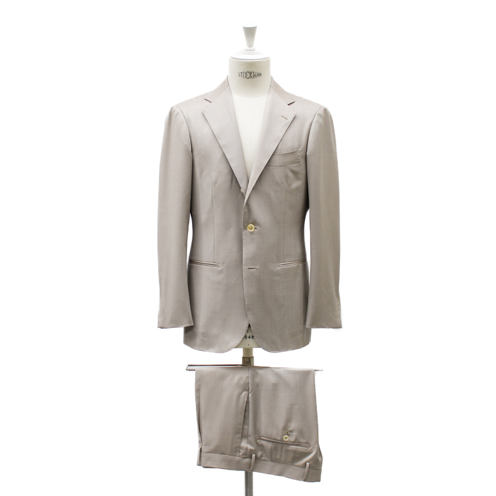ベージュスーツにグレーのヘリンボーンコートを合わせ、トーン・オン・トーンでまとめた洗練された印象のスタイル。ストライプシャツとネクタイを効かせることで、軽やかな色合いにシャープなアクセントを加えています。